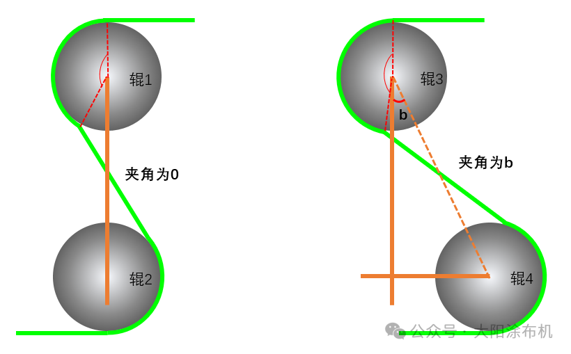 当两辊轴线完全平行时,该夹角为零;若一辊沿水平方向偏移,则两辊间形成水平夹角,包角随之增大。