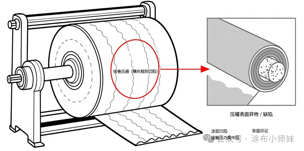 压痕的间距是多少?用这个间距除以卷芯周长或接触辊周长,看看能不能对上某个辊子的尺寸。