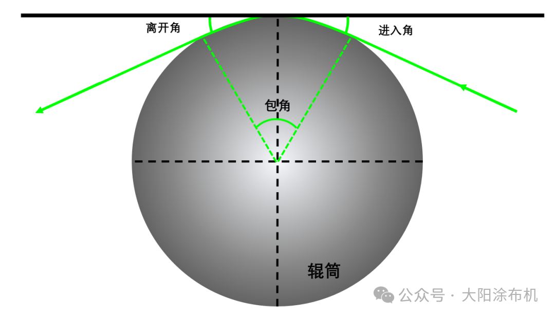 包角是基材在辊筒上实际接触并发生弯曲的弧段所对应的圆心角,通常用角度(°)或弧度(rad)来表示。包角的大小直接决定了基材与辊筒之间的摩擦驱动力和摩擦系数,足够的包角有助于基材在导辊上稳定运行,防止跑偏和起皱。也可以理解为,基材在辊筒的入口、出口的连线所形成的夹角,即为包角。