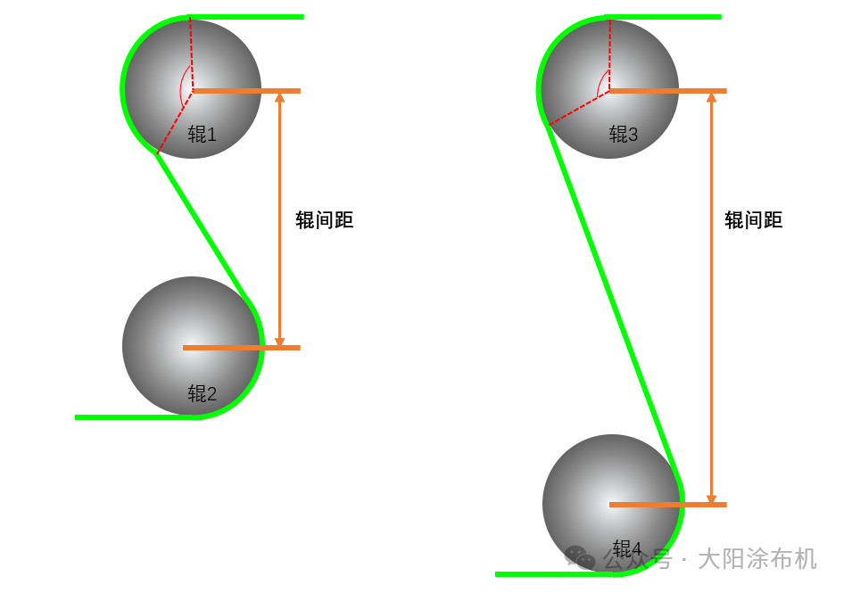 辊间距是指相邻两辊中心之间的水平距离。辊间距越大,基材与辊筒的接触面积越小,包角也越小。